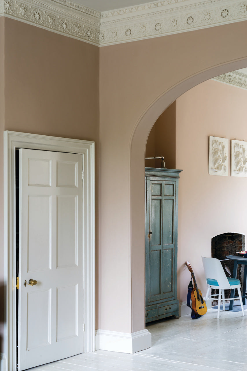 Dimity is a pale taupe with a subtle red base, named after a sheer cotton fabric popular in dressmaking. It has a great amount of warmth and depth, making for instantly welcoming hallways and living rooms. When paired with Pointing, it seems to take on a pinkier tone, while combining it with darker Oxford Stone creates a more aged look.